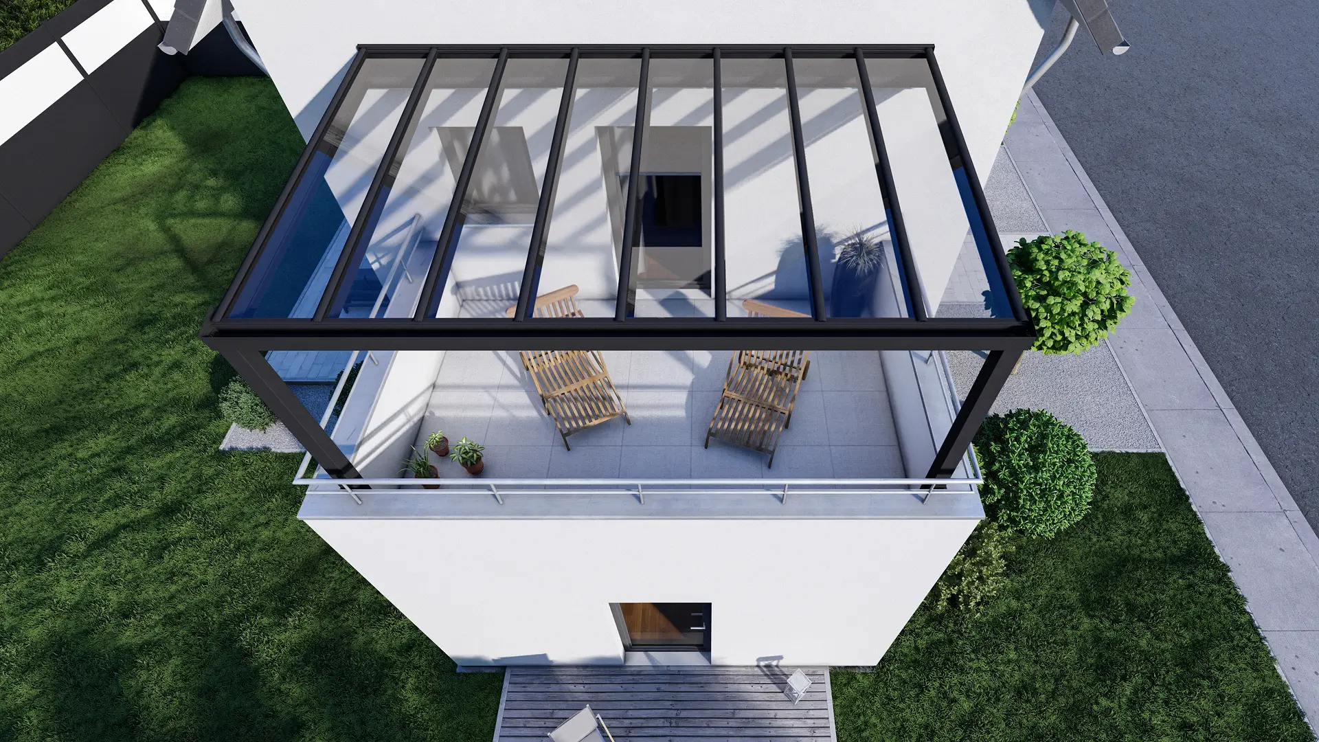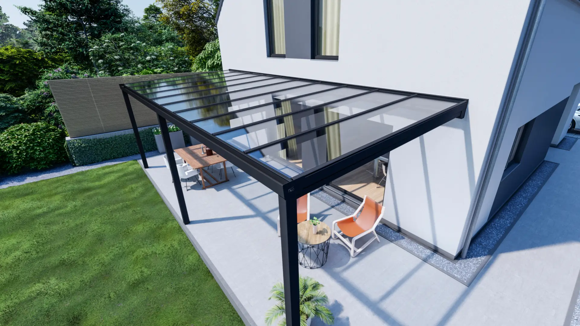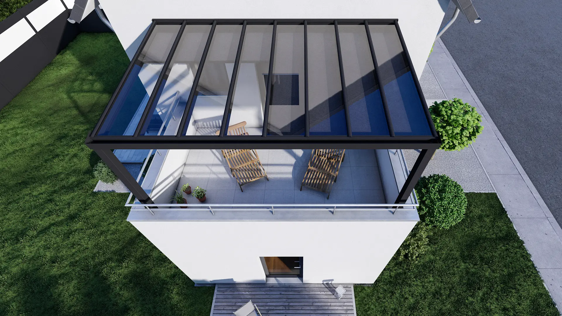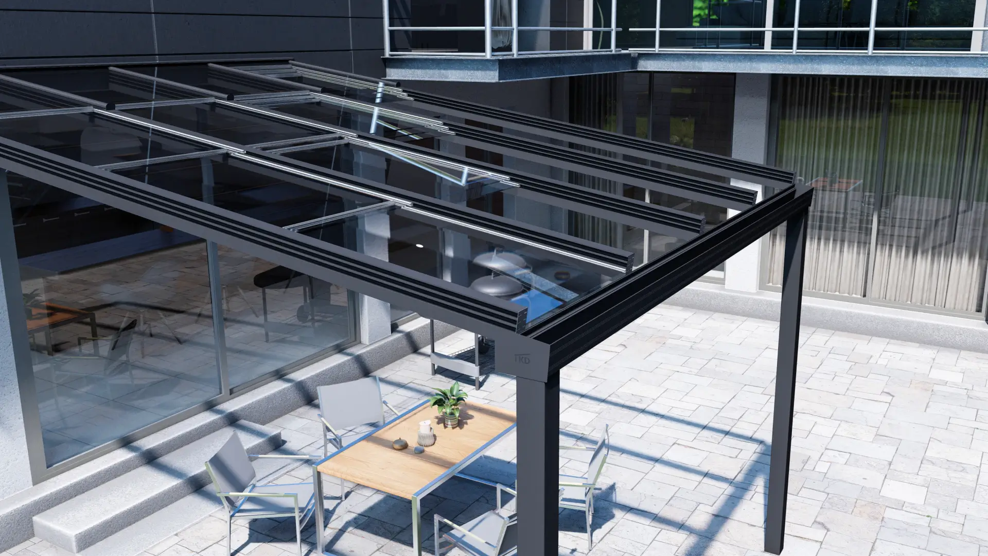 Suporturile autoportant, cu formă inspirată din Schwertdesign, permit lățimi de până la 4 m, iar copertina VSG de 12 mm este disponibilă transparentă sau mată.