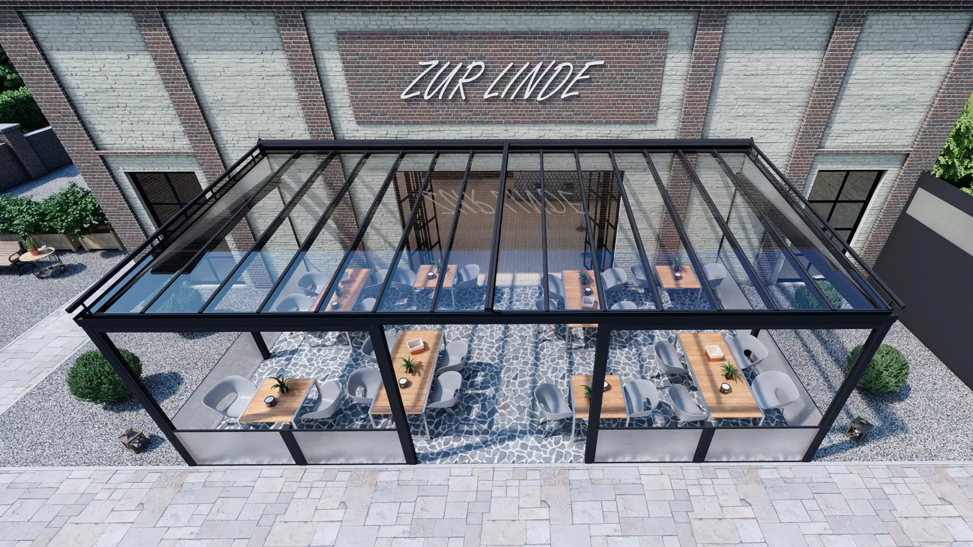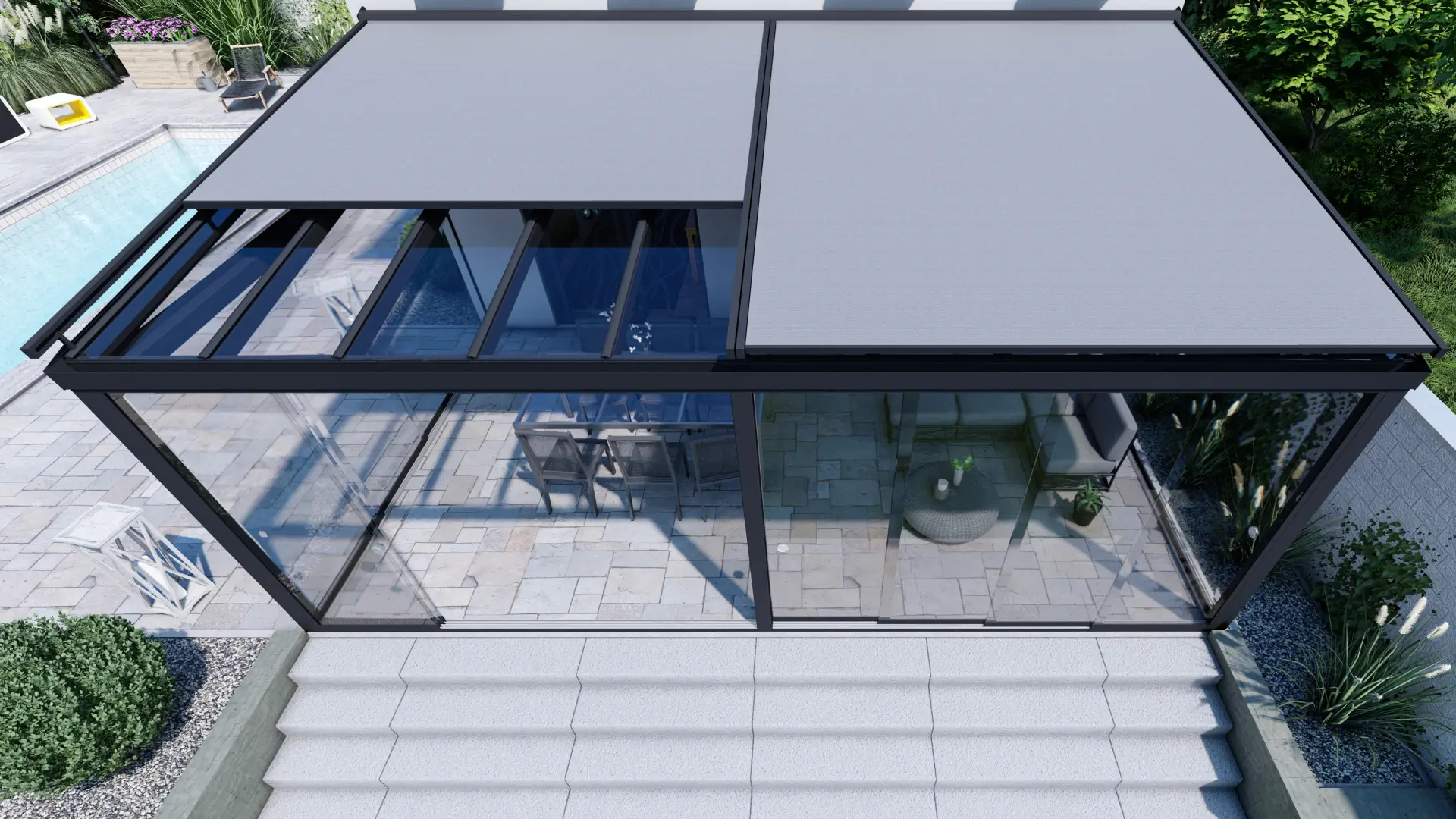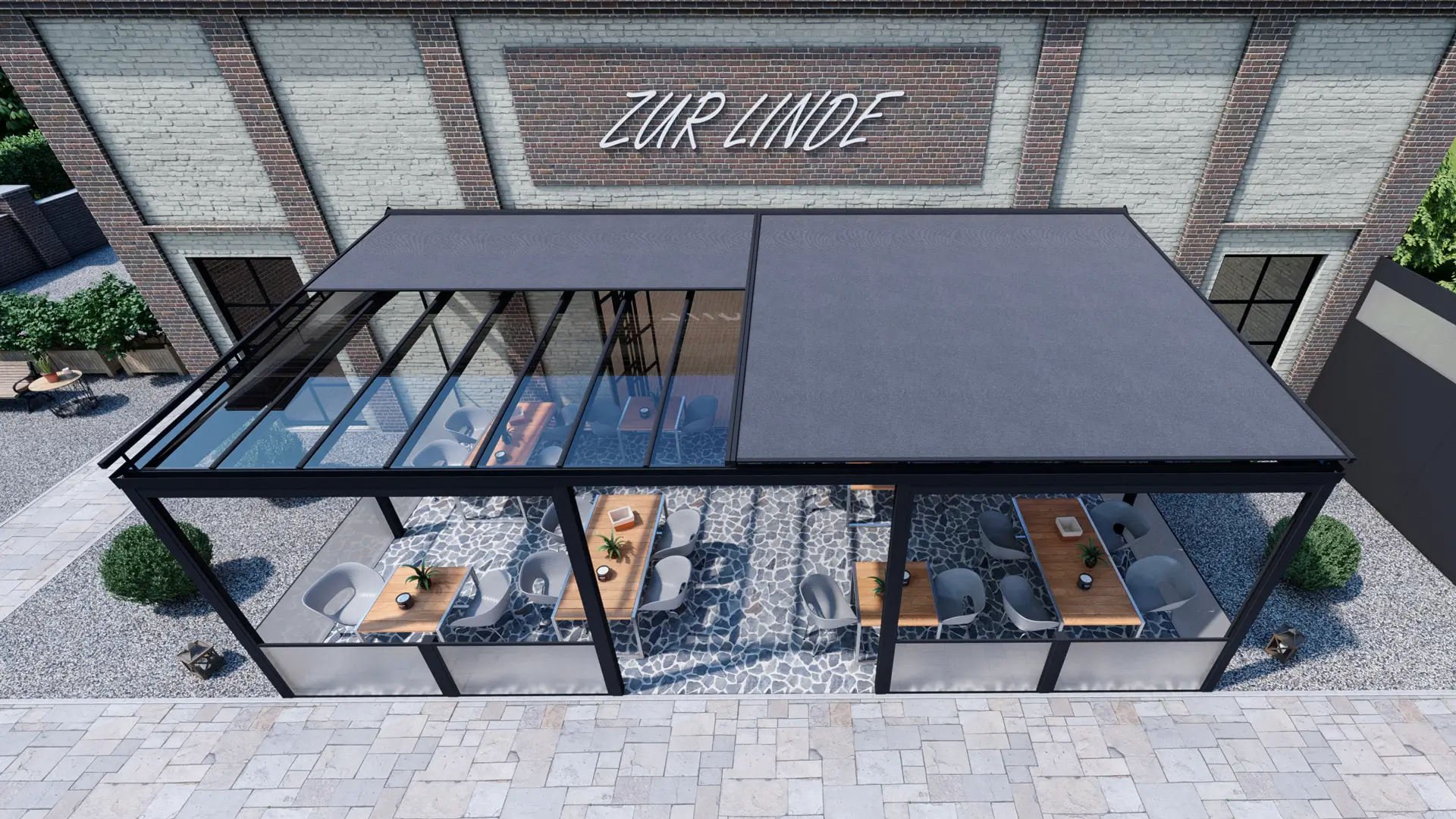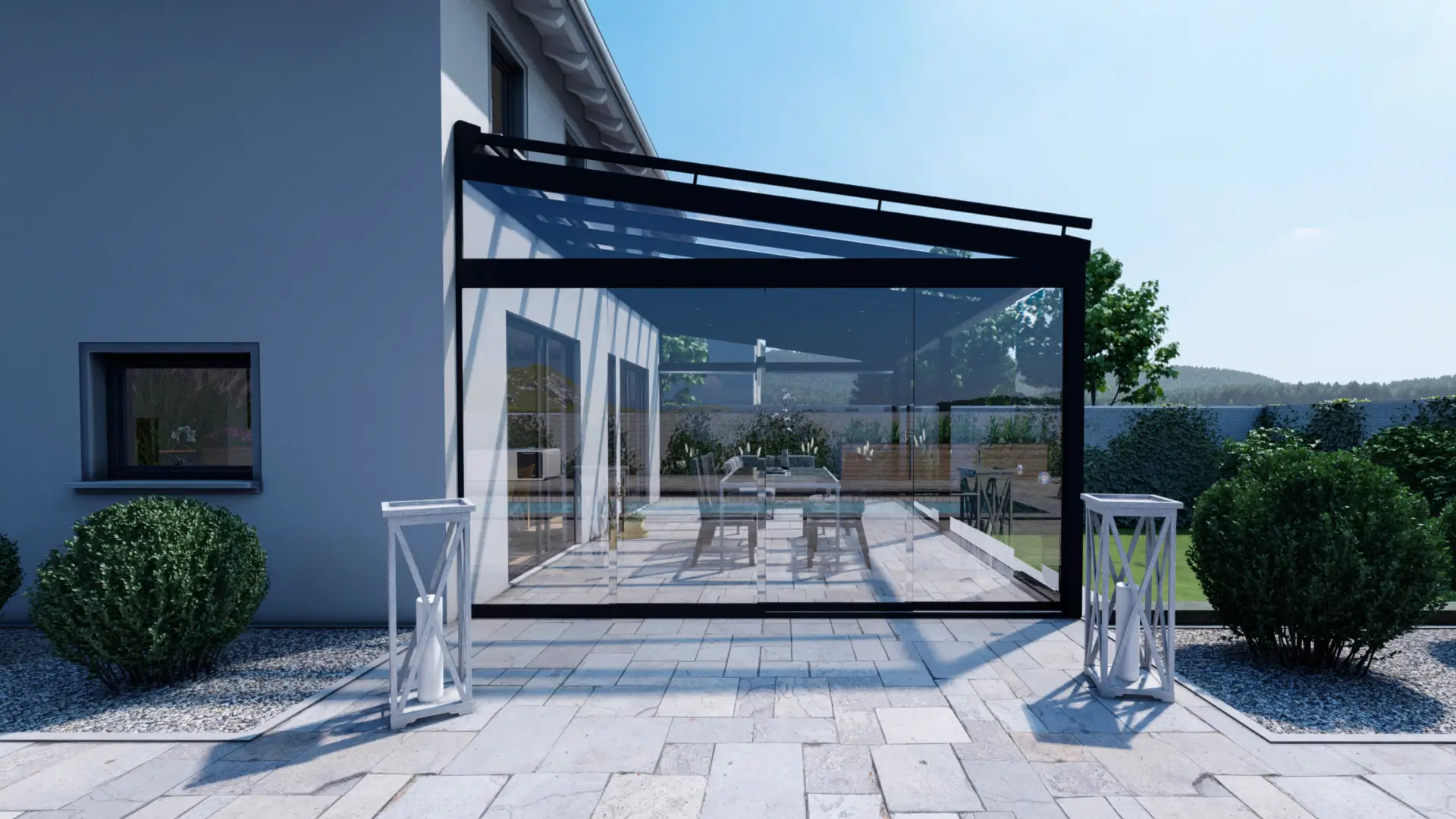 Suporturile autoportant, cu formă inspirată din Schwertdesign, permit lățimi de până la 4 m, iar copertina VSG de 12 mm este disponibilă transparentă sau mată.