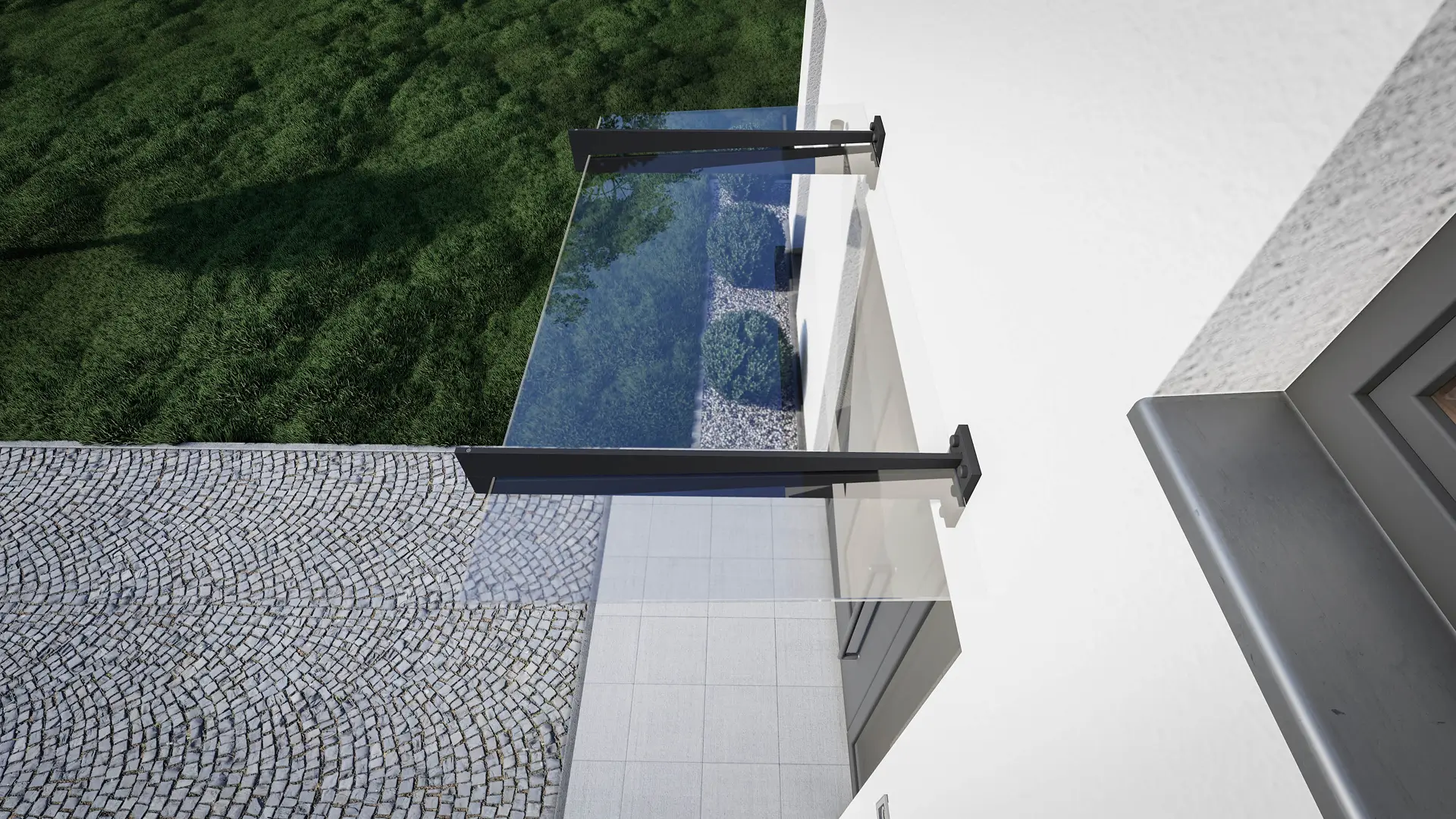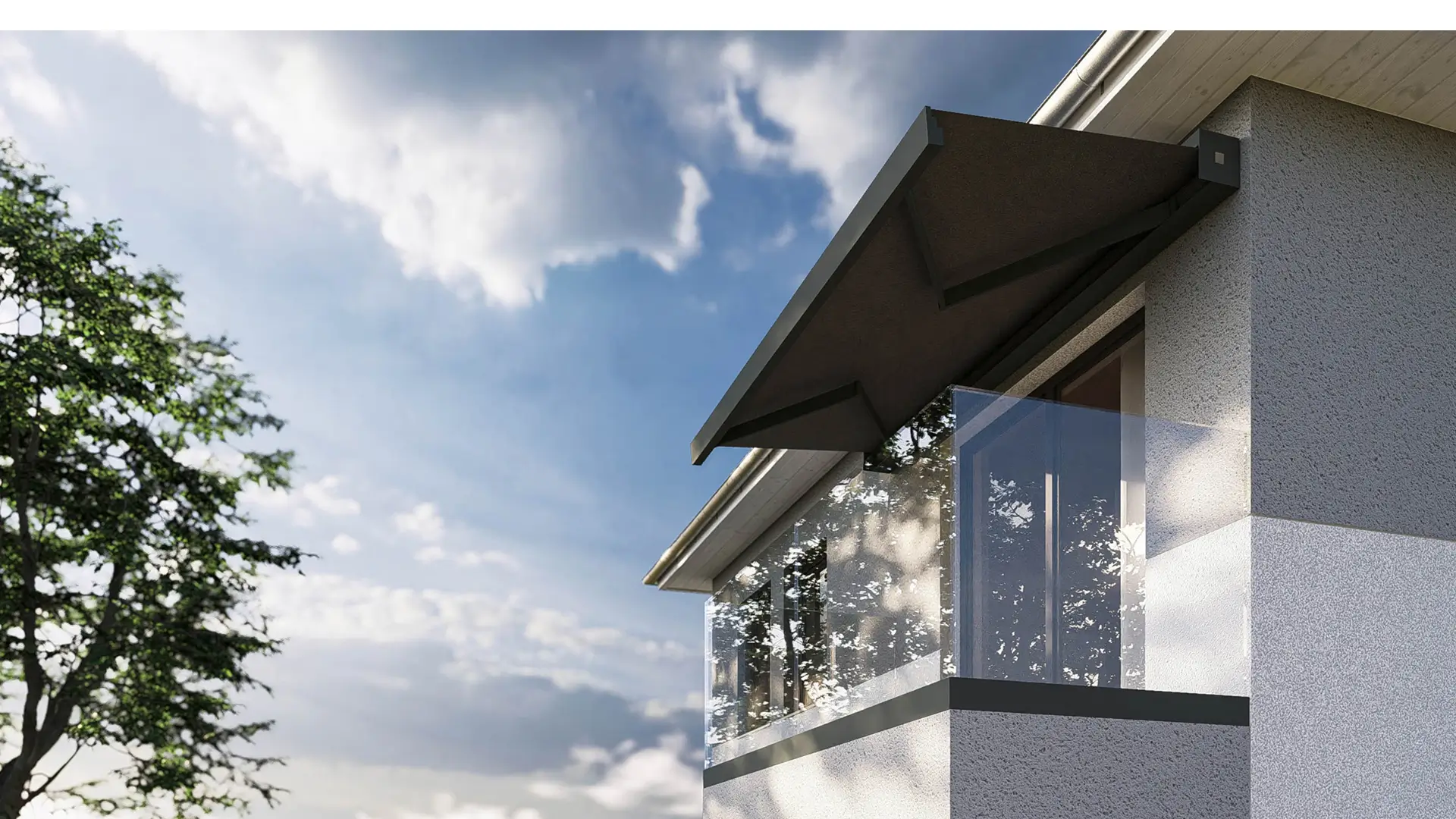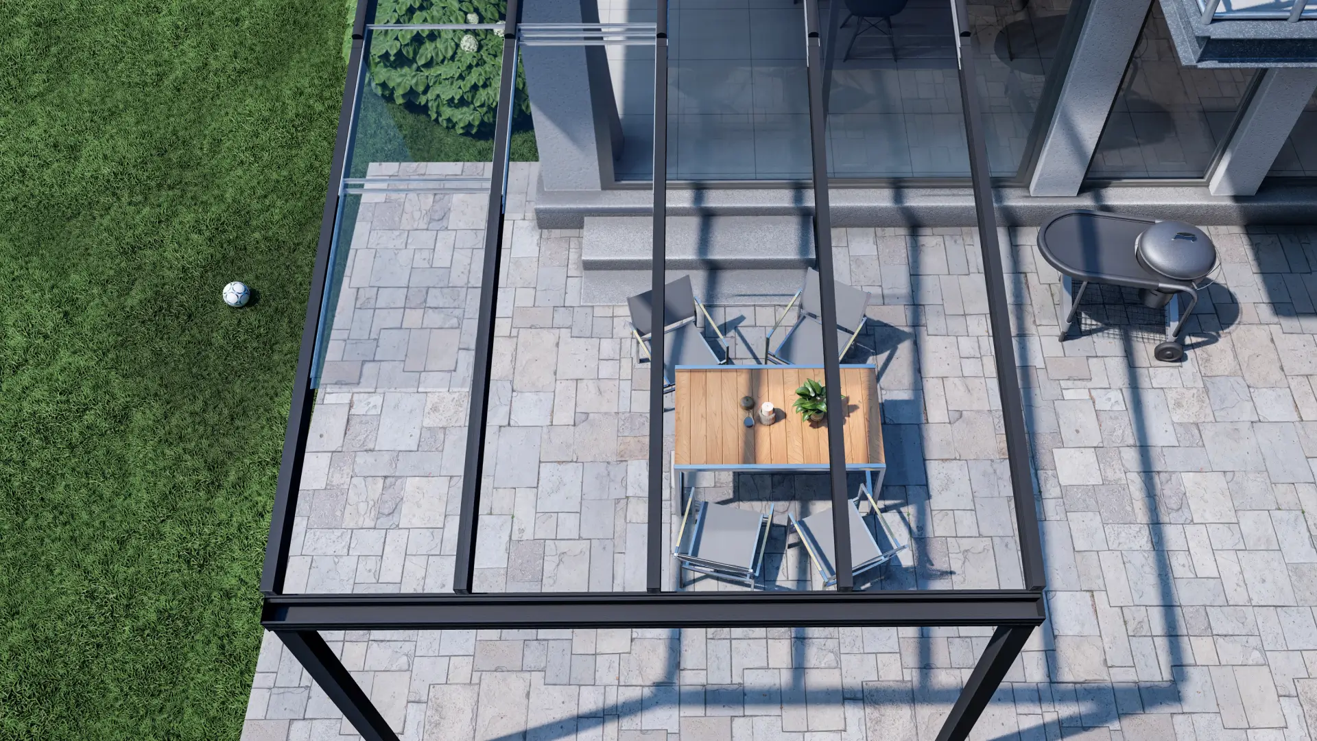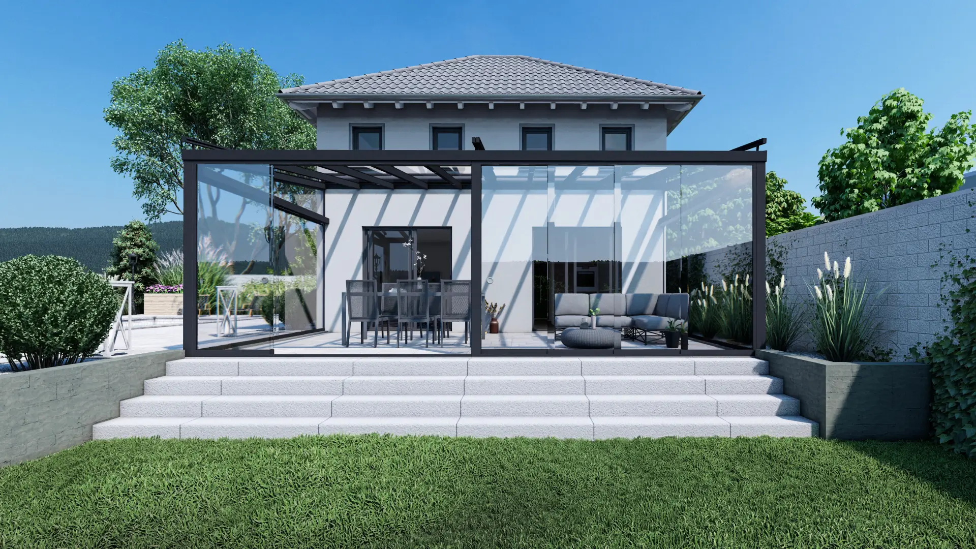 Suporturile autoportant, cu formă inspirată din Schwertdesign, permit lățimi de până la 4 m, iar copertina VSG de 12 mm este disponibilă transparentă sau mată.