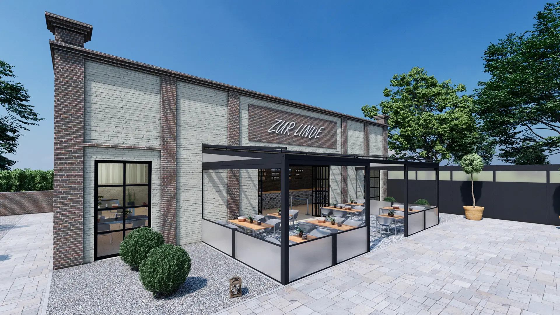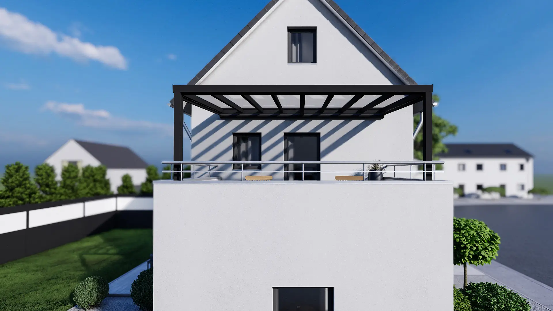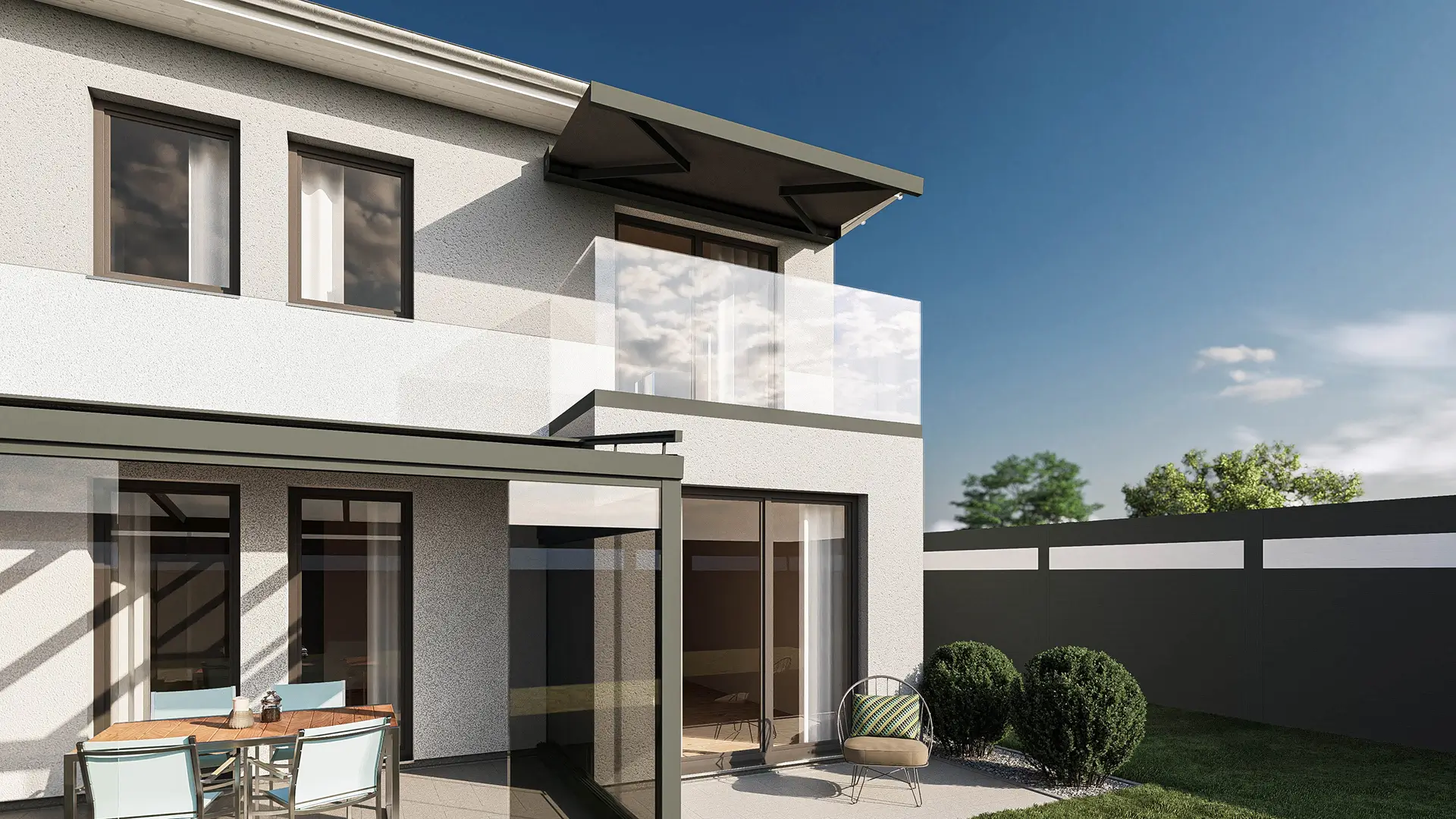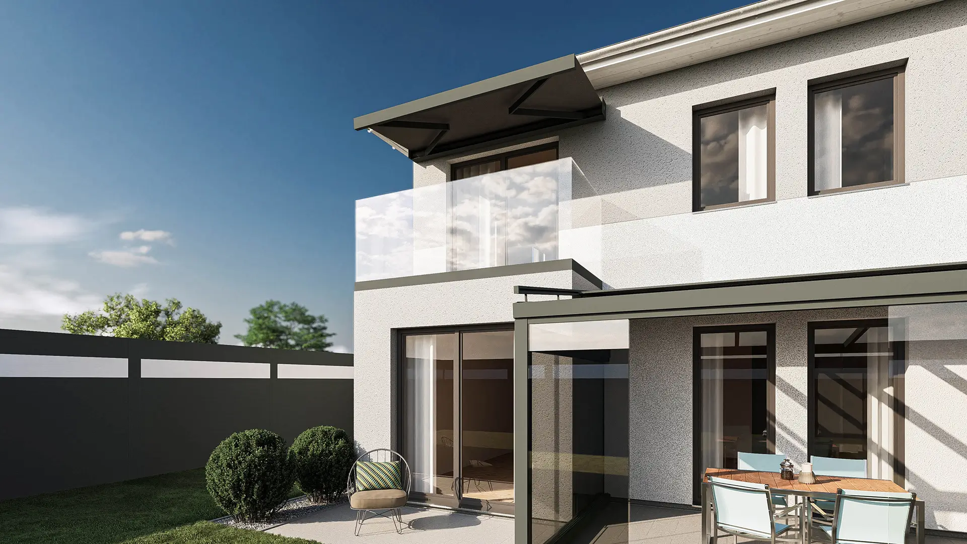 Suporturile autoportant, cu formă inspirată din Schwertdesign, permit lățimi de până la 4 m, iar copertina VSG de 12 mm este disponibilă transparentă sau mată.