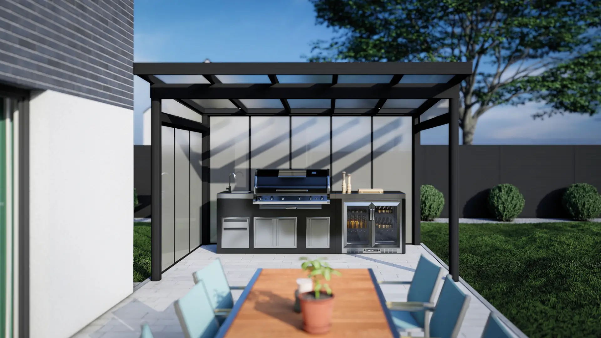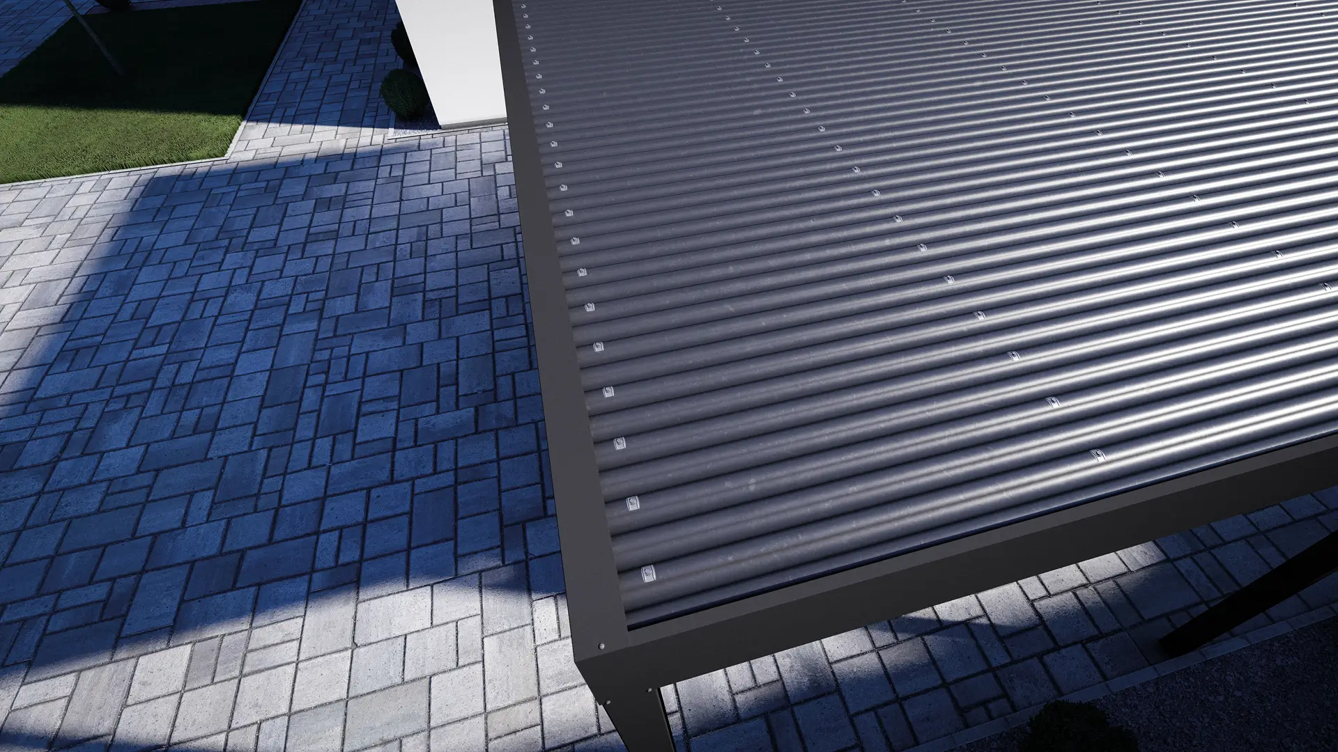 O soluție elegantă și independentă cu aspect modern de otel inoxidabil. Din aluminiu eloxat, rezistent la coroziune, cu acoperiș din policarbonat anti-încălzire. Dimensiuni generoase: 495×272 cm pentru protecție completă și design de durată.